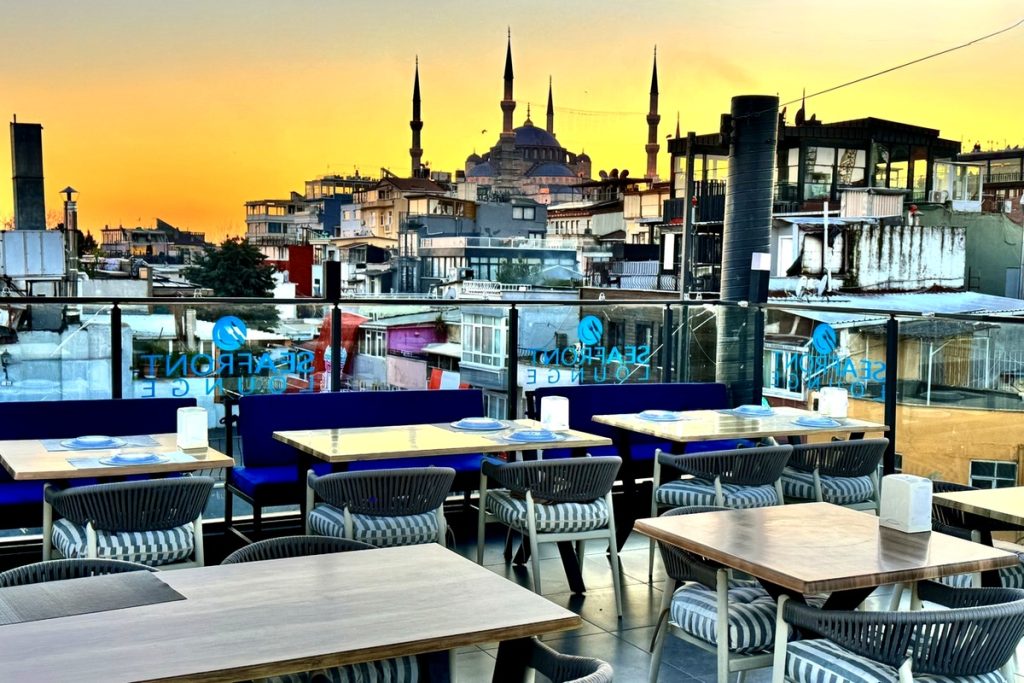 Rooftop dining in Sultanahmet is more than just a meal — it is an experience. Sitting above the historic streets, you can enjoy panoramic views of the Bosphorus, the Marmara Sea, and the iconic skyline filled with mosques and minarets.