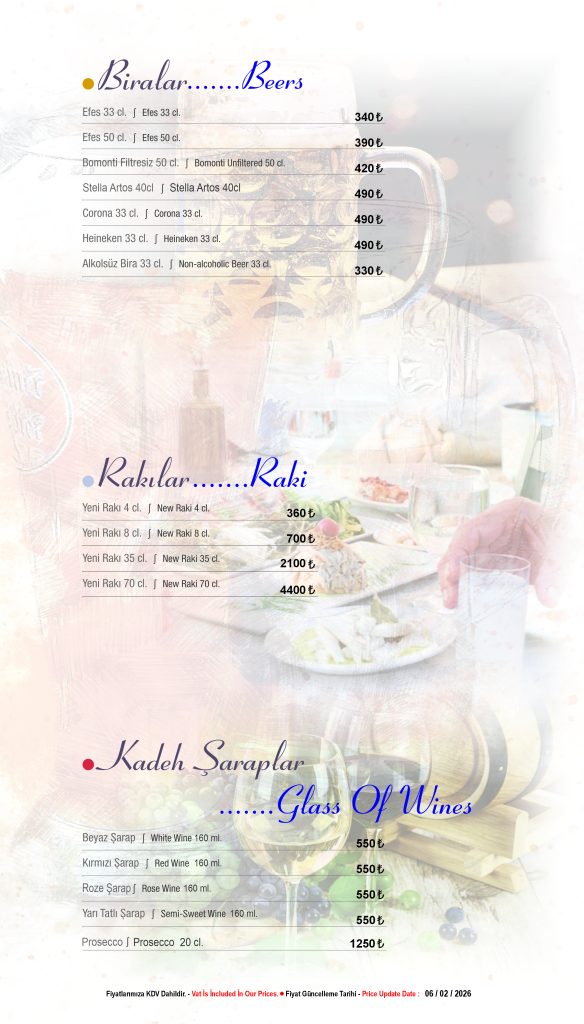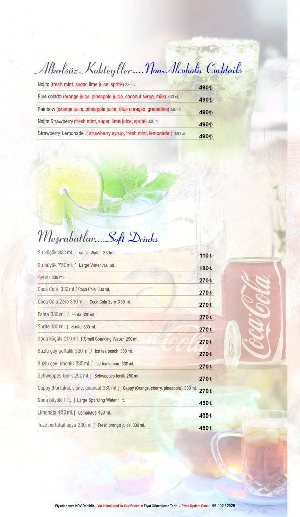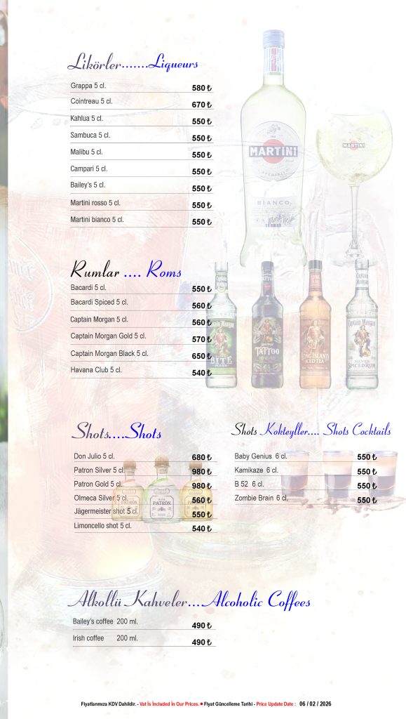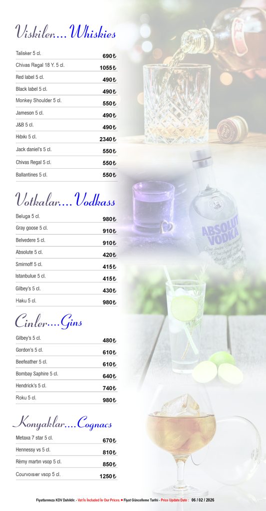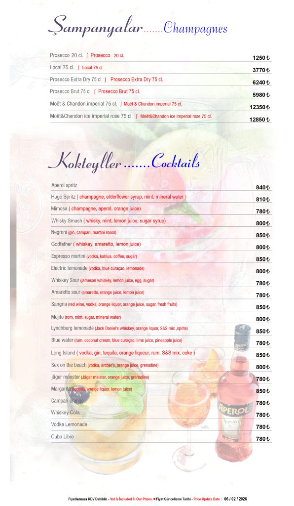 Discover our drink menu at Seafront Lounge, offering a selection of signature cocktails, fine wines and premium beverages. Enjoy your drinks with breathtaking rooftop views in Sultanahmet, Istanbul.